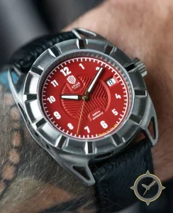 Eine Fahrer-Uhr mit einem 35.5mm Gehäuse im Vintage-Stil gefertigt aus Edelstahl mit einem Zifferblatt in rot und einer besonderen "sunken central section with embossed/chevron grooves"-Oberfläche.