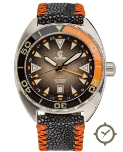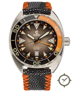 Eine Taucheruhr-Uhr mit einem markanten 43.5mm Auftritt am Handgelenk, gefertigt aus Edelstahl mit einem Zifferblatt in braun und einer besonderen "sunburst"-Oberfläche und einer echten GMT-Funktion, mit der du eine zweite Zeitzone verfolgen kannst.