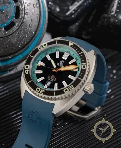 Eine Taucheruhr-Uhr mit einem markanten 45mm Auftritt am Handgelenk, gefertigt aus Edelstahl mit einem Zifferblatt in schwarz und einer besonderen "glossy with turquoise inner chapter ring"-Oberfläche.