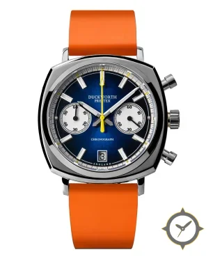 Eine Chronograph-Uhr mit einem markanten 47.5mm Auftritt am Handgelenk, gefertigt aus Edelstahl mit einem Zifferblatt in blau und einer besonderen "sunburst"-Oberfläche.