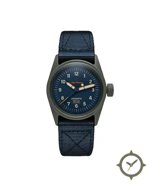Eine Field-Uhr mit einem 32mm Gehäuse im Vintage-Stil gefertigt aus Edelstahl mit einem Zifferblatt in marineblau und einer besonderen "matte"-Oberfläche.