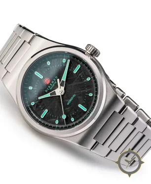 Eine Sport-Uhr mit einem markanten 42mm Auftritt am Handgelenk, gefertigt aus Edelstahl mit einem Zifferblatt in schwarz und einer besonderen "meteorite-style textured finish"-Oberfläche.