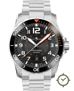 Eine Taucheruhr-Uhr mit einem vielseitigen 38mm Gehäuse, das an fast jedes Handgelenk passt, gefertigt aus Edelstahl mit einem Zifferblatt in schwarz und einer besonderen "matte with concentric circular rings"-Oberfläche.
