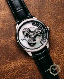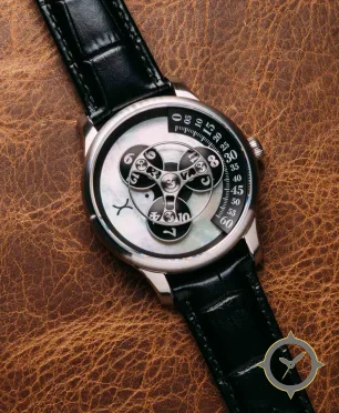 Eine Luxus-Uhr mit einem 34.5mm Gehäuse im Vintage-Stil gefertigt aus Edelstahl mit einem Zifferblatt in weiß und einer besonderen "mother-of-pearl"-Oberfläche.