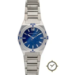 Eine Luxus-Uhr mit einem 33.5mm Gehäuse im Vintage-Stil gefertigt aus Edelstahl mit einem Zifferblatt in blau und einer besonderen "lapis/stone, speckled"-Oberfläche.