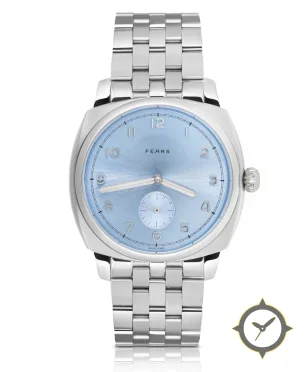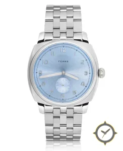 Eine Dress-Uhr mit einem 35mm Gehäuse im Vintage-Stil gefertigt aus Edelstahl mit einem Zifferblatt in blau und einer besonderen "sunburst / radial brushed"-Oberfläche.