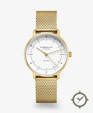 Eine Minimalistisch-Uhr mit einem 29.5mm Gehäuse im Vintage-Stil gefertigt aus Gold mit einem Zifferblatt in weiß und einer besonderen "matte"-Oberfläche.