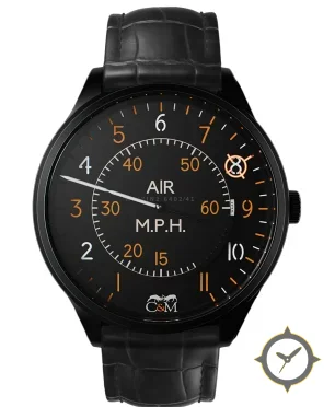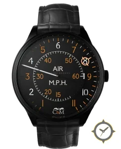 Eine Luftfahrt-Uhr mit einem 34.5mm Gehäuse im Vintage-Stil gefertigt aus Edelstahl mit einem Zifferblatt in schwarz und einer besonderen "matte finish"-Oberfläche.