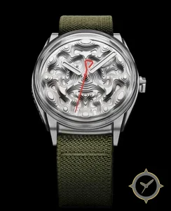 Eine Field-Uhr gefertigt aus Edelstahl mit einem Zifferblatt in weiß und einer besonderen "three-dimensional layered/topographic relief"-Oberfläche.