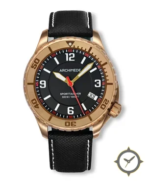 Eine Taucheruhr-Uhr mit einem markanten 44mm Auftritt am Handgelenk, gefertigt aus Bronze mit einem Zifferblatt in schwarz und einer besonderen "matte"-Oberfläche.