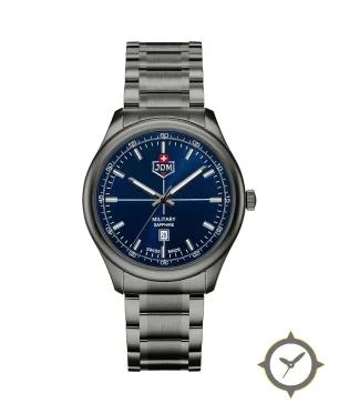 Eine Militär-Uhr mit einem markanten 44.5mm Auftritt am Handgelenk, gefertigt aus Edelstahl mit einem Zifferblatt in marineblau und einer besonderen "sunburst"-Oberfläche.