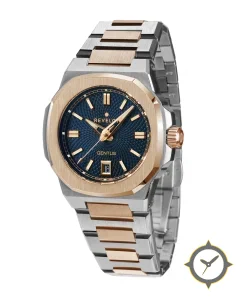 Eine Luxus-Uhr mit einem vielseitigen 40mm Gehäuse, das an fast jedes Handgelenk passt, gefertigt aus Edelstahl mit einem Zifferblatt in blau und einer besonderen "guilloché (waffle)"-Oberfläche.