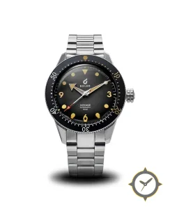 Eine Taucheruhr-Uhr mit einem 33mm Gehäuse im Vintage-Stil gefertigt aus Edelstahl mit einem Zifferblatt in schwarz und einer besonderen "matte fumé gradient"-Oberfläche.
