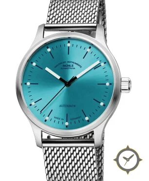 Eine Minimalistisch-Uhr mit einem markanten 41.5mm Auftritt am Handgelenk, gefertigt aus Edelstahl mit einem Zifferblatt in türkis und einer besonderen "radial sunburst"-Oberfläche.