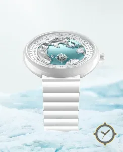Eine Weltzeituhr-Uhr gefertigt aus Edelstahl mit einem Zifferblatt in türkis und einer besonderen "3D raised relief (sculpted continents)"-Oberfläche, ideal für Weltenbummler dank der Weltzeit-Funktion.