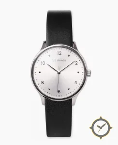 Eine Minimalistisch-Uhr mit einem 34.5mm Gehäuse im Vintage-Stil gefertigt aus Edelstahl mit einem Zifferblatt in silber und einer besonderen "sunburst"-Oberfläche.
