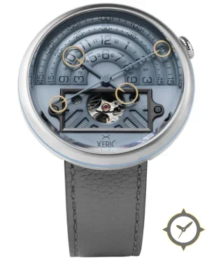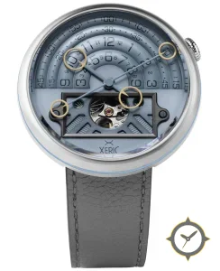 Eine Skelett-Uhr mit einem markanten 48.5mm Auftritt am Handgelenk, gefertigt aus Edelstahl mit einem Zifferblatt in blau und einer besonderen "sunburst/gradient with layered concentric arcs"-Oberfläche.
