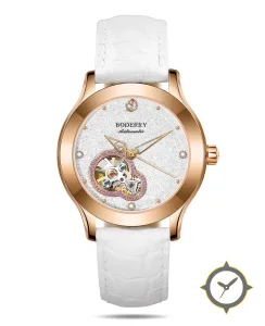 Eine Skelett-Uhr mit einem 32.5mm Gehäuse im Vintage-Stil gefertigt aus Gold mit einem Zifferblatt in weiß und einer besonderen "sparkled/glitter finish"-Oberfläche.