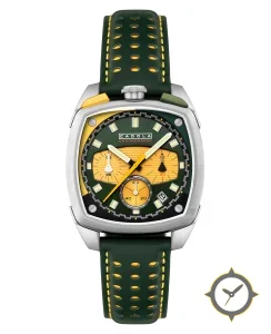 Eine Chronograph-Uhr mit einem 35mm Gehäuse im Vintage-Stil gefertigt aus Edelstahl mit einem Zifferblatt in grün und einer besonderen "matte green main dial with horizontally-striped yellow subdials"-Oberfläche.