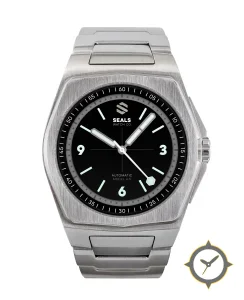 Eine Luxus-Uhr mit einem markanten 49mm Auftritt am Handgelenk, gefertigt aus Edelstahl mit einem Zifferblatt in schwarz und einer besonderen "matte"-Oberfläche.