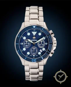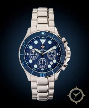 Eine Chronograph-Uhr mit einem markanten 49mm Auftritt am Handgelenk, gefertigt aus Edelstahl mit einem Zifferblatt in blau und einer besonderen "vertical ribbing (striped)"-Oberfläche.