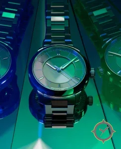 Eine Sport-Uhr mit einem vielseitigen 38mm Gehäuse, das an fast jedes Handgelenk passt, gefertigt aus Edelstahl mit einem Zifferblatt in grün und einer besonderen "sunburst"-Oberfläche.