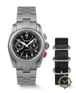 Eine Chronograph-Uhr mit einem vielseitigen 41mm Gehäuse, das an fast jedes Handgelenk passt, gefertigt aus Titan mit einem Zifferblatt in schwarz und einer besonderen "matte"-Oberfläche.