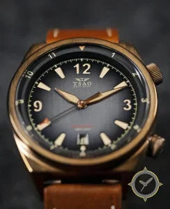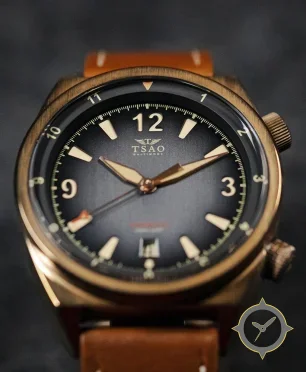 Eine Vintage-Uhr mit einem 34.5mm Gehäuse im Vintage-Stil gefertigt aus Bronze mit einem Zifferblatt in grau und einer besonderen "sunburst"-Oberfläche.