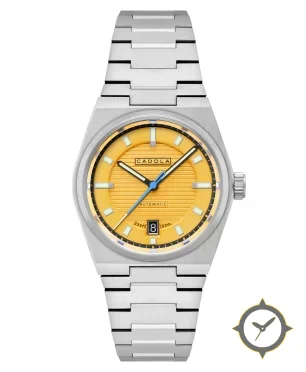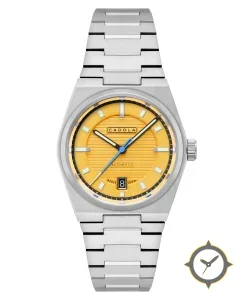 Eine Sport-Uhr mit einem 33.5mm Gehäuse im Vintage-Stil gefertigt aus Edelstahl mit einem Zifferblatt in gelb und einer besonderen "horizontal ribbed lines"-Oberfläche.