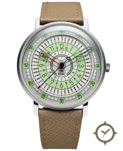 Eine Pilot-Uhr mit einem 36.5mm Gehäuse im Vintage-Stil gefertigt aus Edelstahl mit einem Zifferblatt in grün und einer besonderen "printed concentric scales on a smooth surface"-Oberfläche.