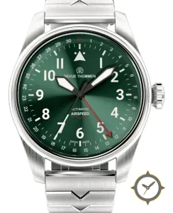 Eine Pilot-Uhr mit einem vielseitigen 38mm Gehäuse, das an fast jedes Handgelenk passt, gefertigt aus Edelstahl mit einem Zifferblatt in grün und einer besonderen "sunburst"-Oberfläche.