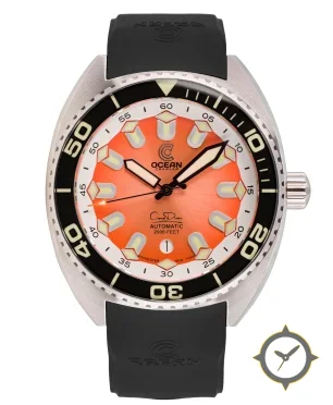 Eine Taucheruhr-Uhr mit einem markanten 52mm Auftritt am Handgelenk, gefertigt aus Edelstahl mit einem Zifferblatt in orange und einer besonderen "sunburst"-Oberfläche.
