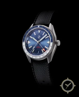 Eine GMT-Uhr mit einem 35.5mm Gehäuse im Vintage-Stil gefertigt aus Edelstahl mit einem Zifferblatt in blau und einer besonderen "sunburst"-Oberfläche und einer echten GMT-Funktion, mit der du eine zweite Zeitzone verfolgen kannst.