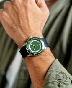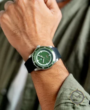Eine Taucheruhr-Uhr mit einem markanten 47mm Auftritt am Handgelenk, gefertigt aus Edelstahl mit einem Zifferblatt in grün und einer besonderen "smooth matte with printed minute track"-Oberfläche.