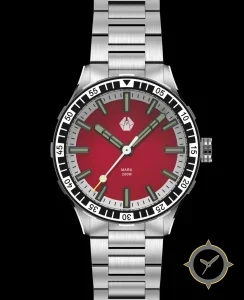 Eine Taucheruhr-Uhr gefertigt aus Edelstahl mit einem Zifferblatt in rot und einer besonderen "matte"-Oberfläche.