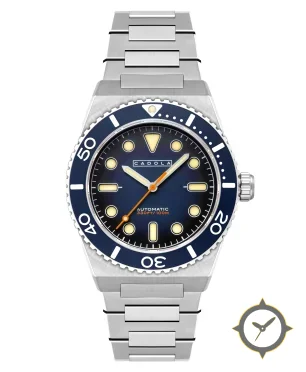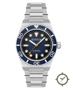 Eine Taucheruhr-Uhr mit einem 37.5mm Gehäuse im Vintage-Stil gefertigt aus Edelstahl mit einem Zifferblatt in marineblau und einer besonderen "sunburst/gradient"-Oberfläche.