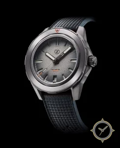 Eine Taucheruhr-Uhr mit einem 32.5mm Gehäuse im Vintage-Stil gefertigt aus Titan mit einem Zifferblatt in grau und einer besonderen "sandblasted/grained"-Oberfläche.
