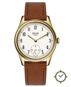 Eine Dress-Uhr mit einem 35mm Gehäuse im Vintage-Stil gefertigt aus Gold mit einem Zifferblatt in weiß und einer besonderen "smooth lacquer"-Oberfläche.