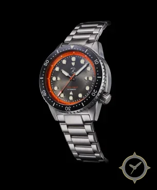 Eine Taucheruhr-Uhr mit einem markanten 45.5mm Auftritt am Handgelenk, gefertigt aus Edelstahl mit einem Zifferblatt in grau und einer besonderen "sunburst / radial textured finish"-Oberfläche.