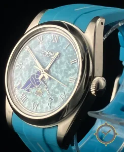 Eine Nautisch-Uhr mit einem 32.5mm Gehäuse im Vintage-Stil gefertigt aus Edelstahl mit einem Zifferblatt in türkis und einer besonderen "marbled, water-like texture"-Oberfläche.