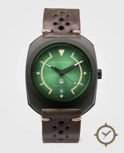 Eine Racing-Uhr mit einem markanten 47mm Auftritt am Handgelenk, gefertigt aus Edelstahl mit einem Zifferblatt in grün und einer besonderen "sunburst"-Oberfläche.