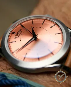 Eine Minimalistisch-Uhr mit einem 37mm Gehäuse im Vintage-Stil gefertigt aus Edelstahl mit einem Zifferblatt in orange und einer besonderen "sunburst"-Oberfläche.