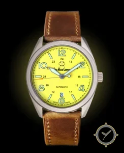 Eine Field-Uhr mit einem 36mm Gehäuse im Vintage-Stil gefertigt aus Edelstahl mit einem Zifferblatt in gelb und einer besonderen "matte"-Oberfläche.