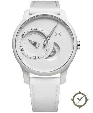 Eine Minimalistisch-Uhr mit einem 33.5mm Gehäuse im Vintage-Stil gefertigt aus Keramik mit einem Zifferblatt in weiß und einer besonderen "matte, smooth"-Oberfläche.