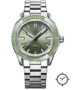 Eine Taucheruhr-Uhr mit einem 33.5mm Gehäuse im Vintage-Stil gefertigt aus Edelstahl mit einem Zifferblatt in grün und einer besonderen "sunburst/radial textured"-Oberfläche.