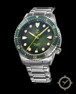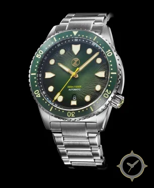Eine Taucheruhr-Uhr mit einem markanten 50.5mm Auftritt am Handgelenk, gefertigt aus Edelstahl mit einem Zifferblatt in grün und einer besonderen "sunburst"-Oberfläche.