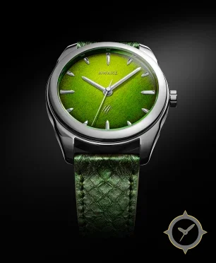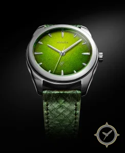 Eine Dress-Uhr mit einem markanten 43mm Auftritt am Handgelenk, gefertigt aus Edelstahl mit einem Zifferblatt in grün und einer besonderen "mottled"-Oberfläche.