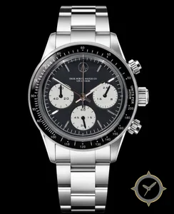 Eine Chronograph-Uhr gefertigt aus Edelstahl mit einem Zifferblatt in schwarz und einer besonderen "matte"-Oberfläche.