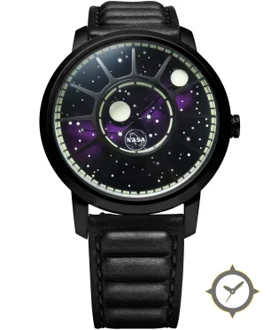 Eine Luftfahrt-Uhr mit einem markanten 42mm Auftritt am Handgelenk, gefertigt aus Edelstahl mit einem Zifferblatt in lila und einer besonderen "galaxy gradient with speckled star-field"-Oberfläche und einer wunderschönen Mondphasenanzeige.