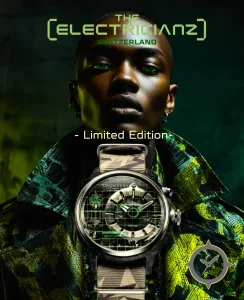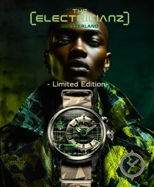 Eine Taktisch-Uhr mit einem vielseitigen 40.5mm Gehäuse, das an fast jedes Handgelenk passt, gefertigt aus Carbon mit einem Zifferblatt in schwarz und einer besonderen "multi-layered transparent dial with neon-green grid and circuit-like printed elements"-Oberfläche.